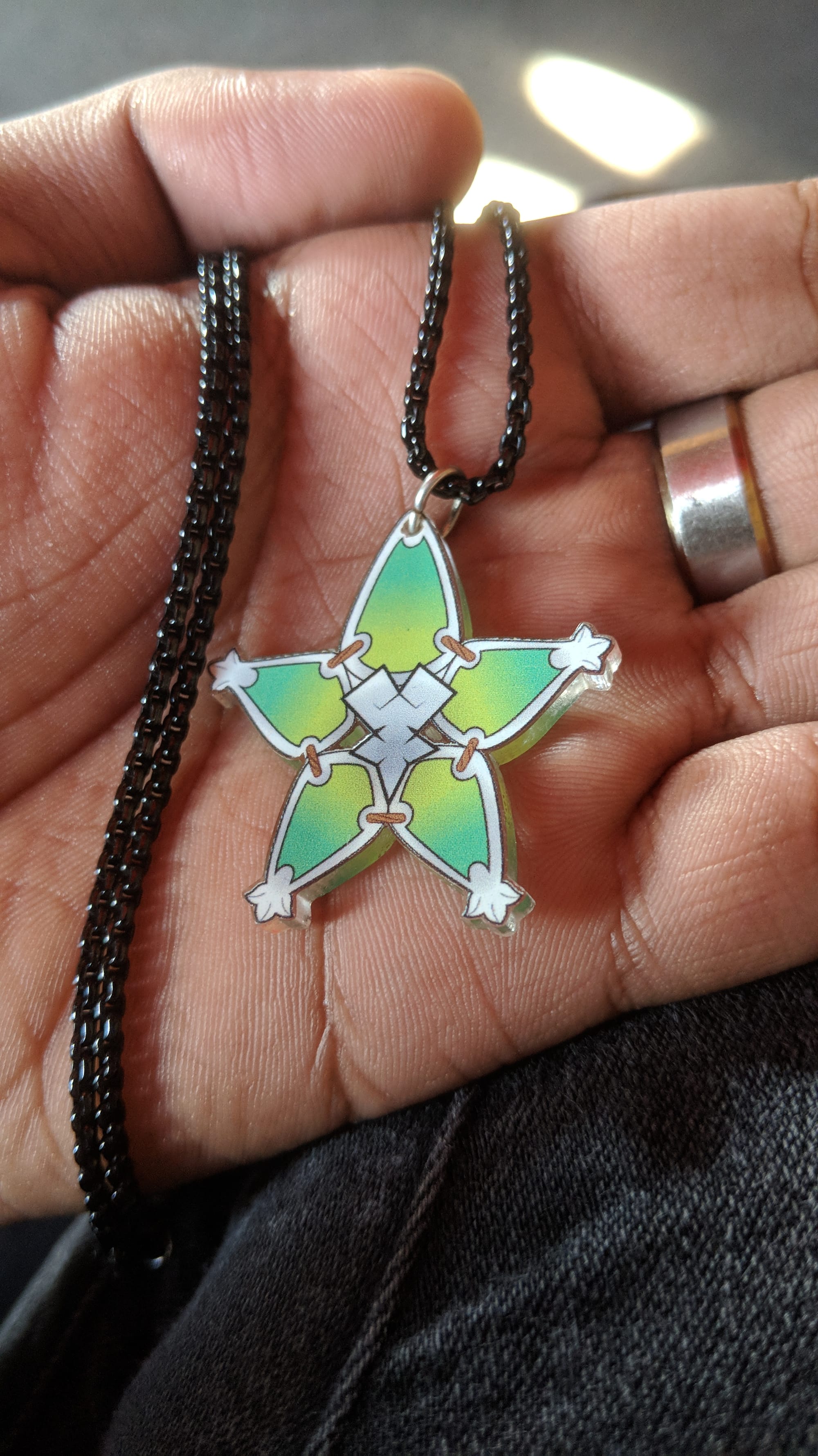 In the Kingdom Hearts series, a Wayfinder is a lucky charm that gets its shape from a "paopu fruit". There's a legend in game that says if two people share the same paopu fruit, they will remain a part of each other's lives forever. This symbolic bond applies to these Wayfinders, and in a sense, these necklaces. After a year I swapped out the chain, but every time I left the house, I carried this with me.