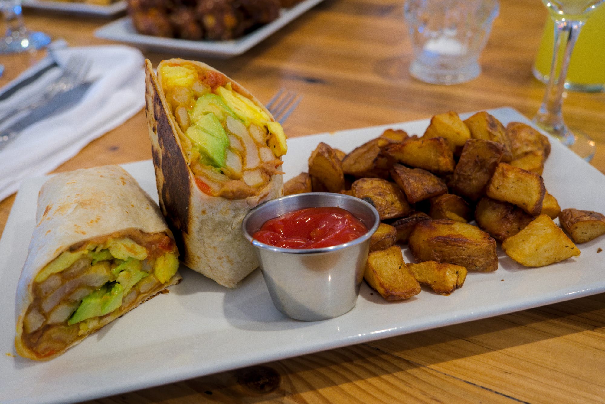 For my main course, I had a breakfast burrito that had eggs, bacon, avocado, french fries, and gochujang aioli, with a side of potatoes. We ended up going through 13 carafes of mimosas in 90 minutes. We tipped the waiter really well.