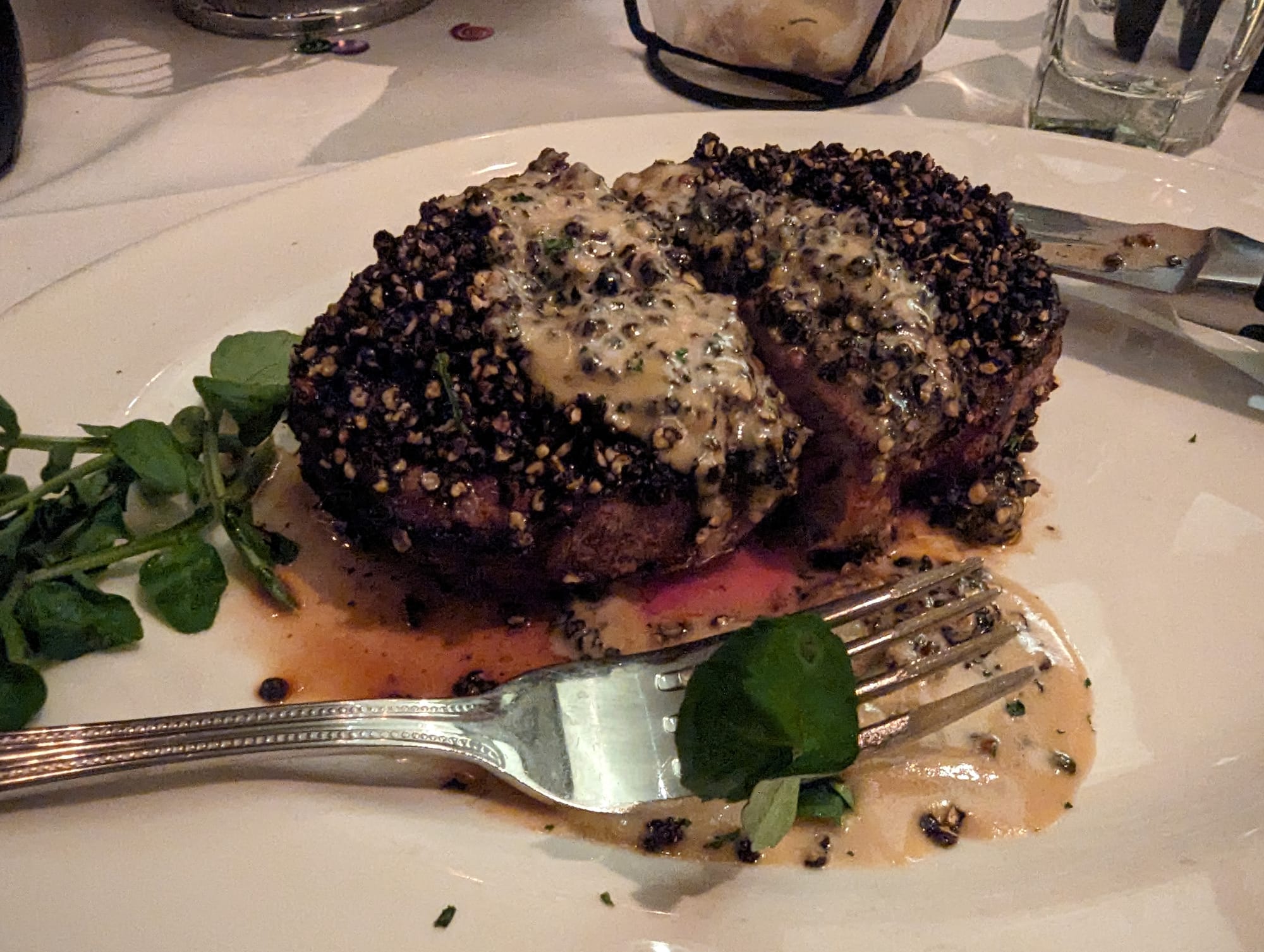 For dinner, we headed to a steak place. With some great food that I neglected to take pictures of, for appetizers we got lobster macaroni and cheese, truffle fries, asparagus, brussels sprouts, and probably some more food. I had a dry-aged New York strip steak smothered in peppercorns for my main course and I tried to eat all of the peppercorns, but I barely managed to get through half of them.